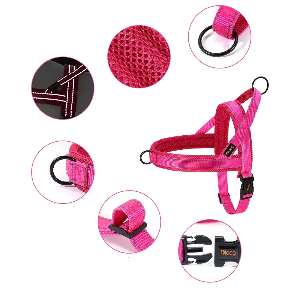 Gemaakt van hoogwaardig nylon en gewatteerd pluche, biedt dit no-pull voorharnas een veilige pasvorm voor actieve honden. Het is geschikt voor verschillende hondenmaten en -rassen en zorgt voor een comfortabele ervaring tijdens wandelingen.
