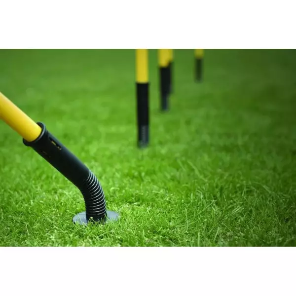 De houder heeft een veerkoppeling zodat de stokken mee kunnen buigen, en een stalen pin waarmee het geheel in de grond gestoken kan worden.