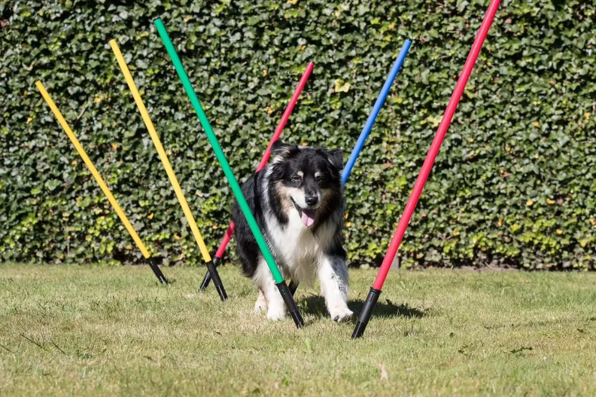 Zet een stok op de houder en leer de hond linksom en rechtsom om de stok heen te lopen. Doe dit eerst met behulp van iets lekkers in je hand en probeer dit later op afstand.