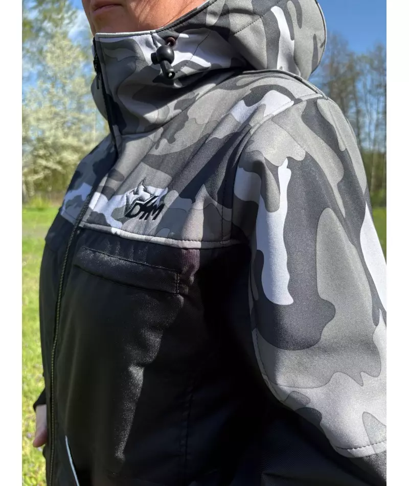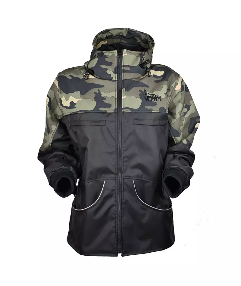 De jas is zwart met groene of winter camouflage en heeft een reflecterende bies