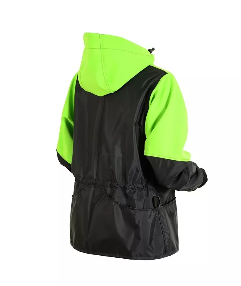 Het zwarte gedeelte van de jas is gedeeltelijk waterdicht, rubber gecoat onder de 100% PES voering