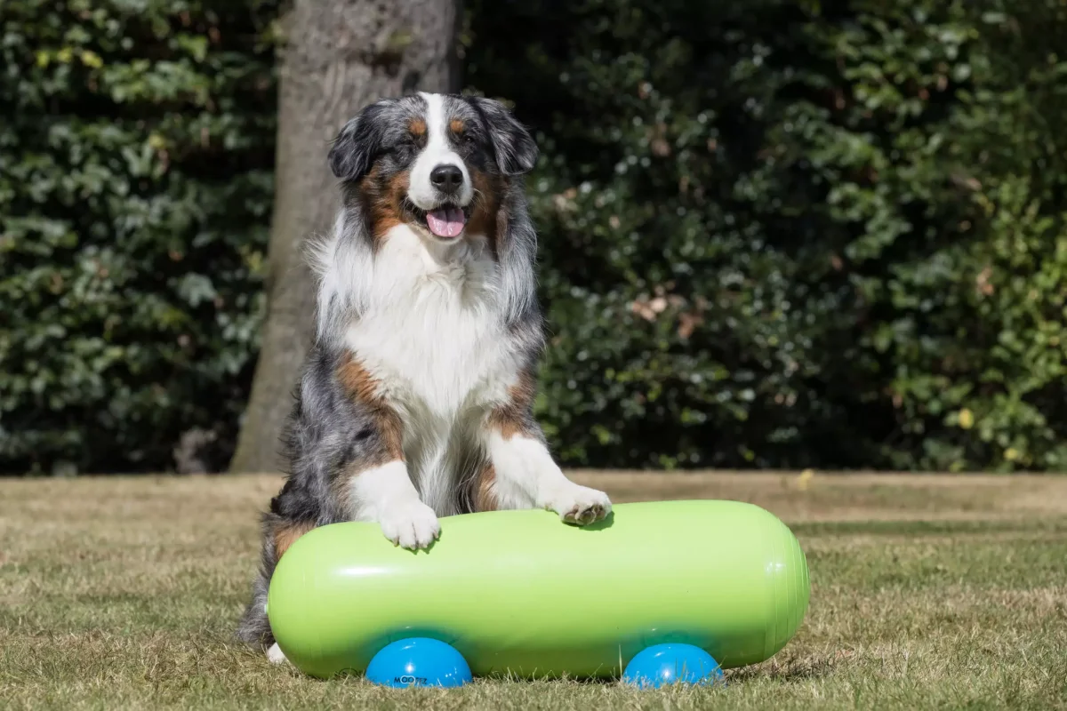 De unieke vorm van de Gymnic Training Rol maakt dynamische oefeningen mogelijk. Door lichte rolbewegingen wordt de hond uitgedaagd om voortdurend kleine correcties te maken, wat meerdere spiergroepen tegelijk aanspreekt.