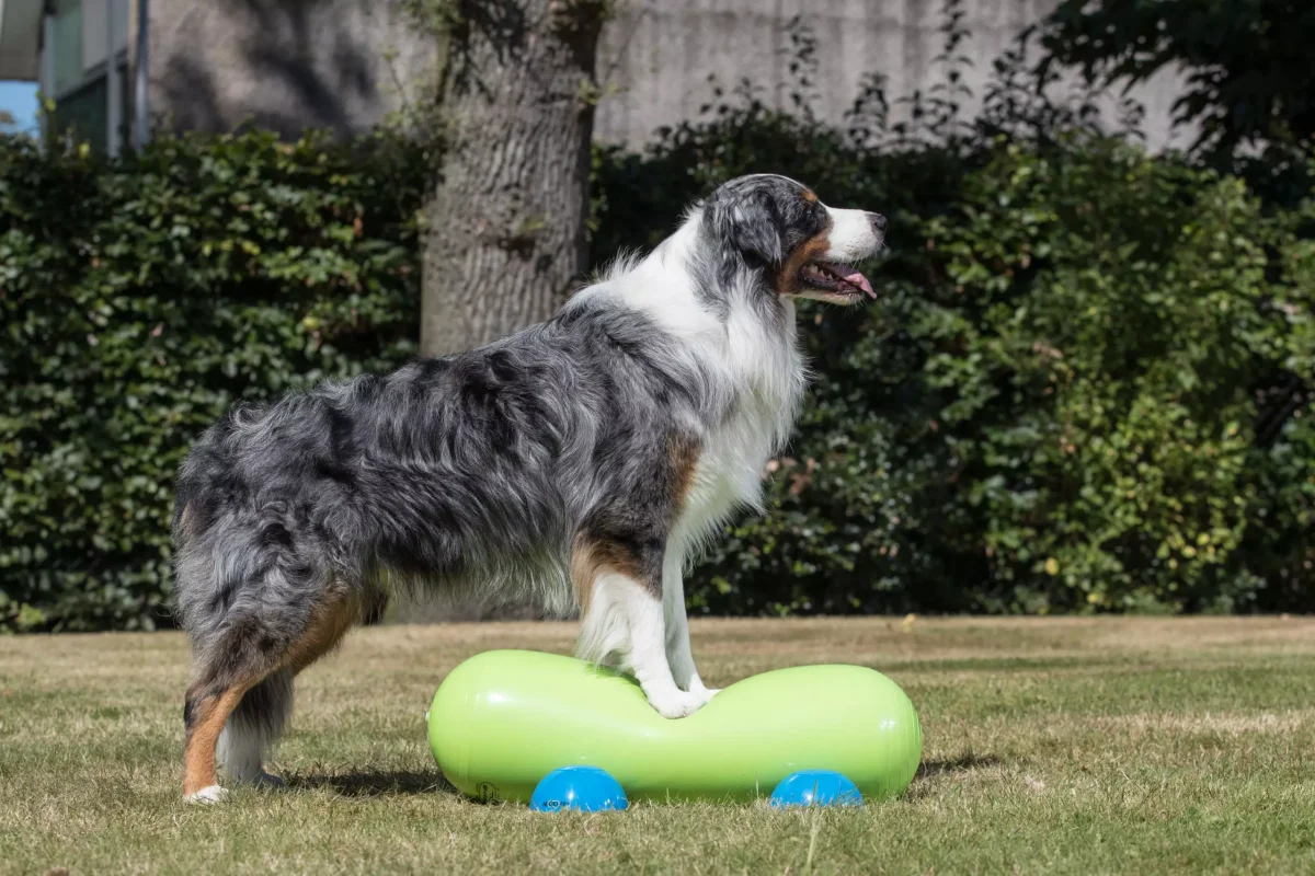 De Gymnic Training Rol Groen helpt honden hun lichaamsbewustzijn te vergroten. Door de instabiliteit van de rol leert de hond bewuster omgaan met pootplaatsing en houding, wat een positieve invloed heeft op dagelijkse bewegingen en sportprestaties.