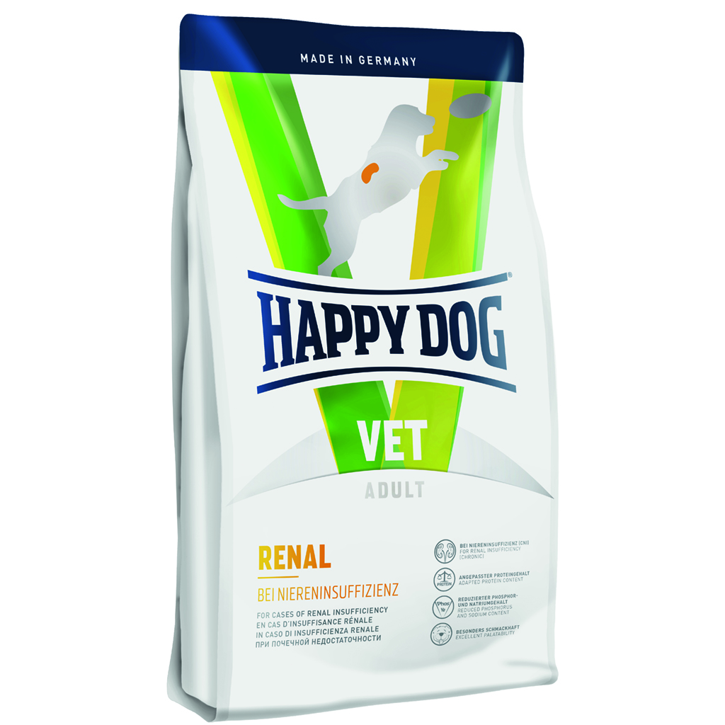 - De aanbevolen gebruiksduur van Happy Dog VET Renal bedraagt bij chronische nierinsufficiëntie aanvankelijk ten hoogste zes maanden. Als de dierenvoeding wordt aangeraden bij acute nierinsufficiëntie, is de aanbevolen