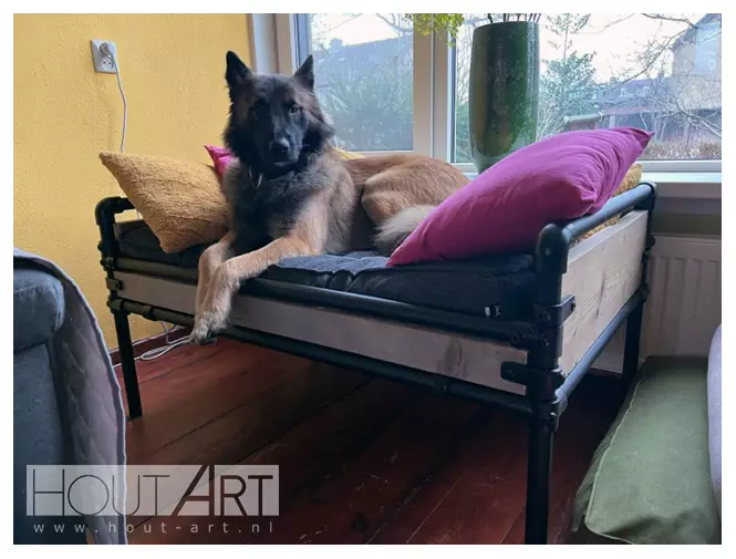Hondenmand van zwarte steigerbuis met steigerhout, voor je hond of kat!