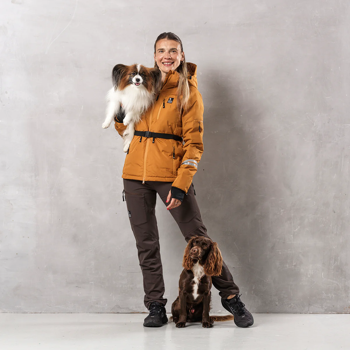 Wat deze jas écht uniek maakt, zijn de praktische details speciaal voor hondeneigenaren. Denk aan een poepzakhouder, snackvakje, kliksysteem voor de hondenlijn en een handige treat pocket op de mouw – perfect gepositioneerd voor snelle beloning.