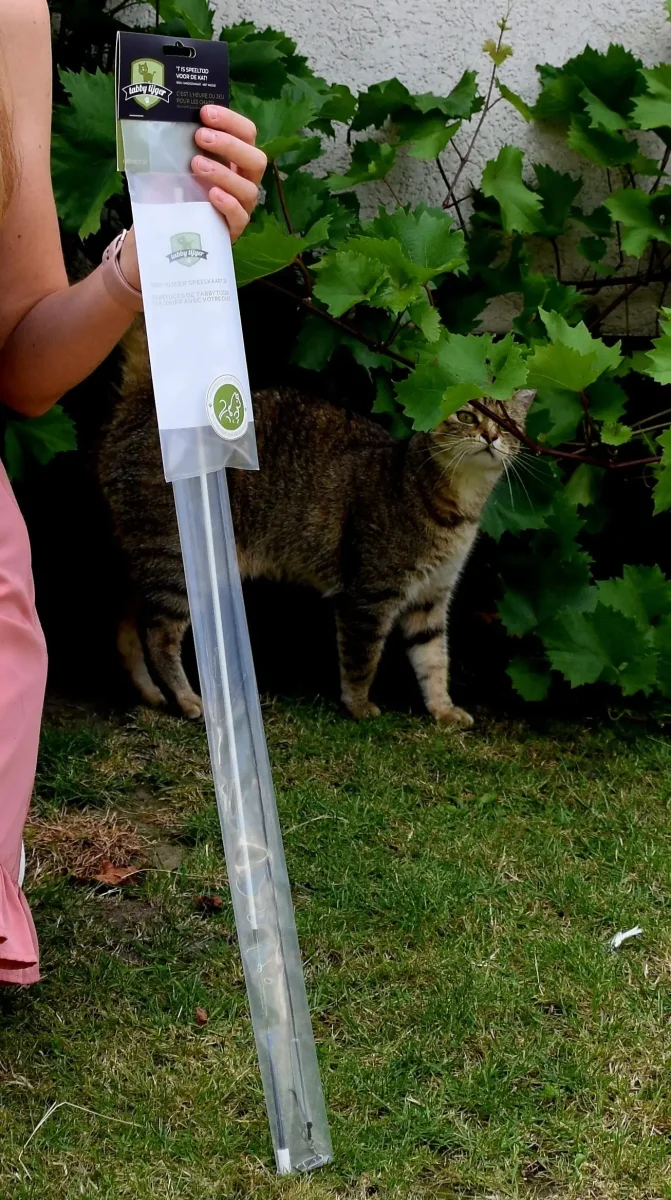 Toch is deze kattenhengel ook erg sterk en slijtvast, Het gebruik van hoogwaardige glasvezel zorgt voor flexibiliteit, maar ook voor stevigheid. Hierdoor is het materiaal niet makkelijk kapot te maken, zelfs niet door erg speelse katten. Ook bij intensief gebruik, zoals bij jonge en energieke kittens, zal deze hengel niet snel breken. De Tabby Tijger speelhengel is dus een erg duurzame keuze, waar je kat jarenlang plezier mee zal beleven.