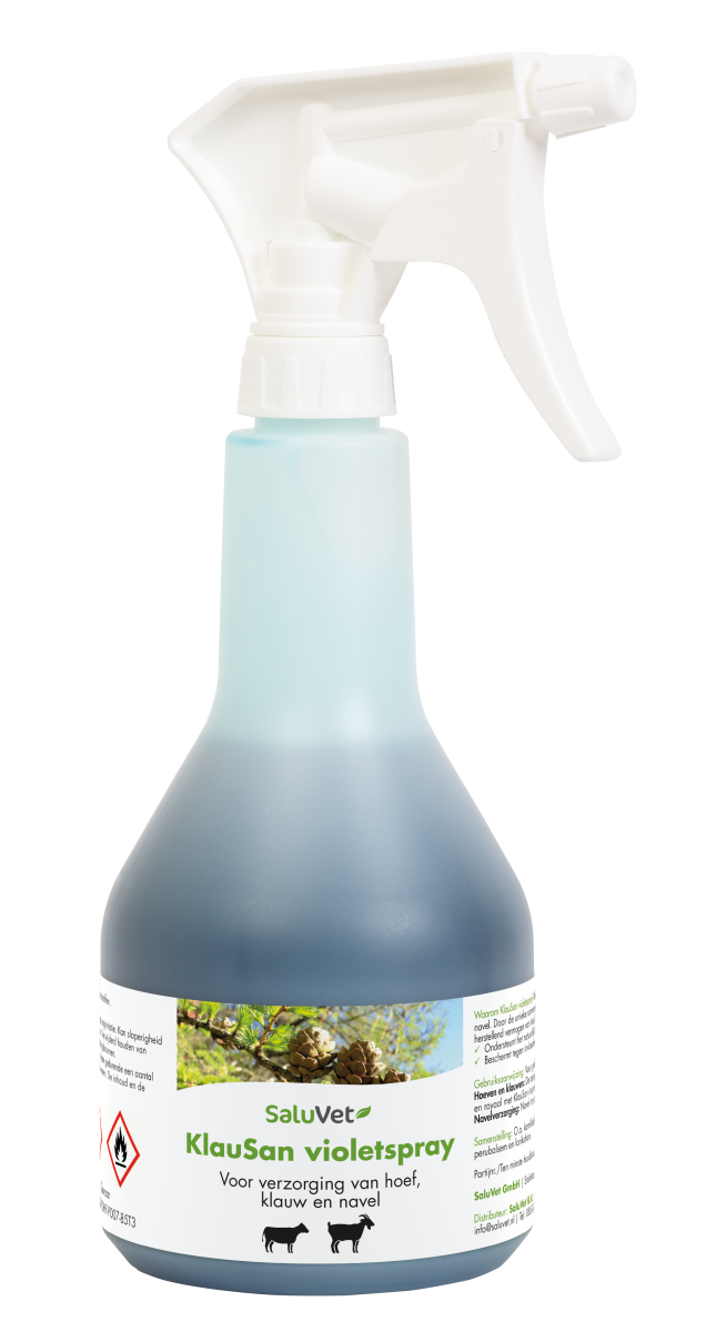 KlauSan is een natuurlijke verzorgende violetspray die het natuurlijk herstel van de klauwen ondersteunt. De unieke samenstelling beschermt de klauw tegen invloeden van buitenaf en bevat geen schadelijke stoffen, zoals antibiotica, zware metalen of drijfgas. KlauSan violetspray is dus 100% natuurlijk goed voor de klauw! De herstellende werking treedt direct na aanbrengen op. KlauSan is een erg dunne vloeistof waardoor het gemakkelijk in alle naden van de klauw komt, net als kruipolie!