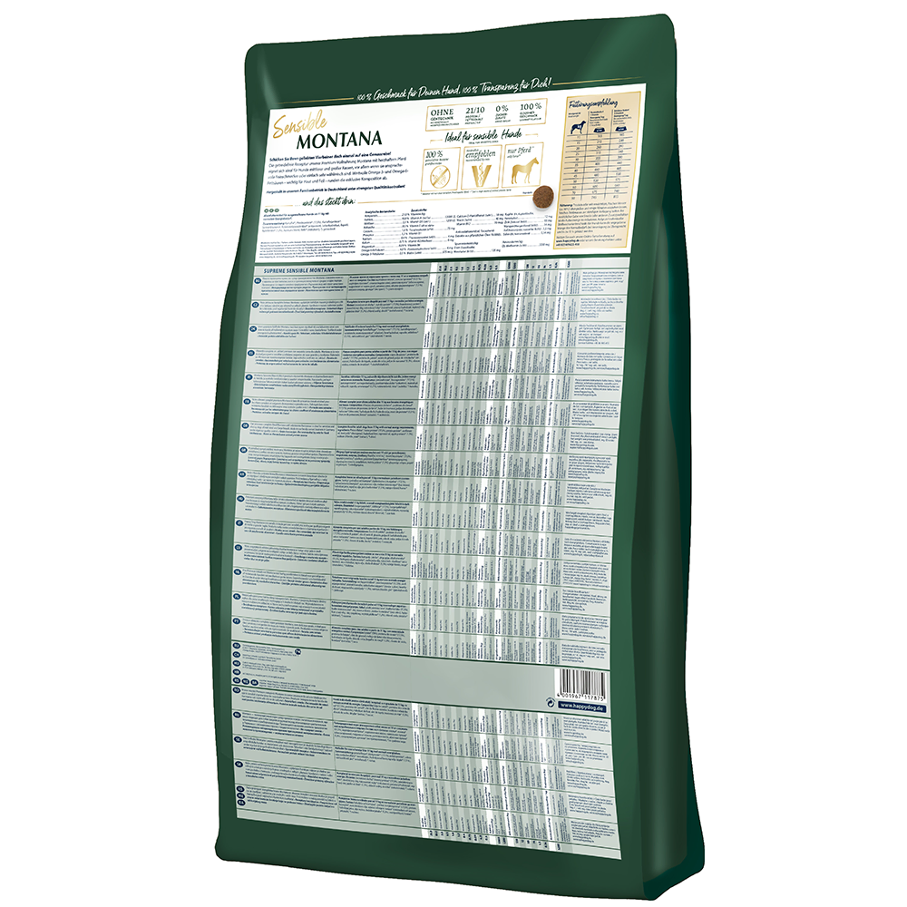 Het Super-Premium totaalvoer Happy Dog Montana bestaat uit een fijne en exclusieve samenstelling uit hartig paardenvlees en aardappel. Daarmee is het droogvoer niet enkel ideaal voor fijnproevers, maar ook perfect geschikt voor kieskeurige, gevoelige honden. Door het uiterst lage proteïnegehalte is het bovendien ook optimaal voor honden met voedingsmiddelenintoleranties – aanbevolen door dierenartsen. De receptuur zonder granen is licht verteerbaar en een absolute smaakbelevenis. Daarmee laat u uw geliefde viervoeter echt genieten.