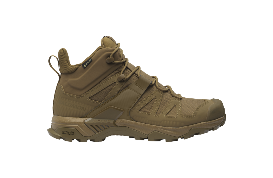 De grip van de Salomon Forces X-Ultra Forces MID GTX Coyote komt voort uit de Contagrip buitenzool die ontworpen is voor maximale controle op zowel droge als natte ondergronden. De diepe profielgroeven zorgen dat vuil en modder worden afgevoerd, zodat je grip behouden blijft, zelfs bij nat gras, bosgrond of stoffige paden. De zool geeft vertrouwen tijdens het afdalen en stabiliteit bij het dragen van zware uitrusting. Hierdoor is de schoen ideaal voor operationele inzet, outdooractiviteiten en ruige terreinen.