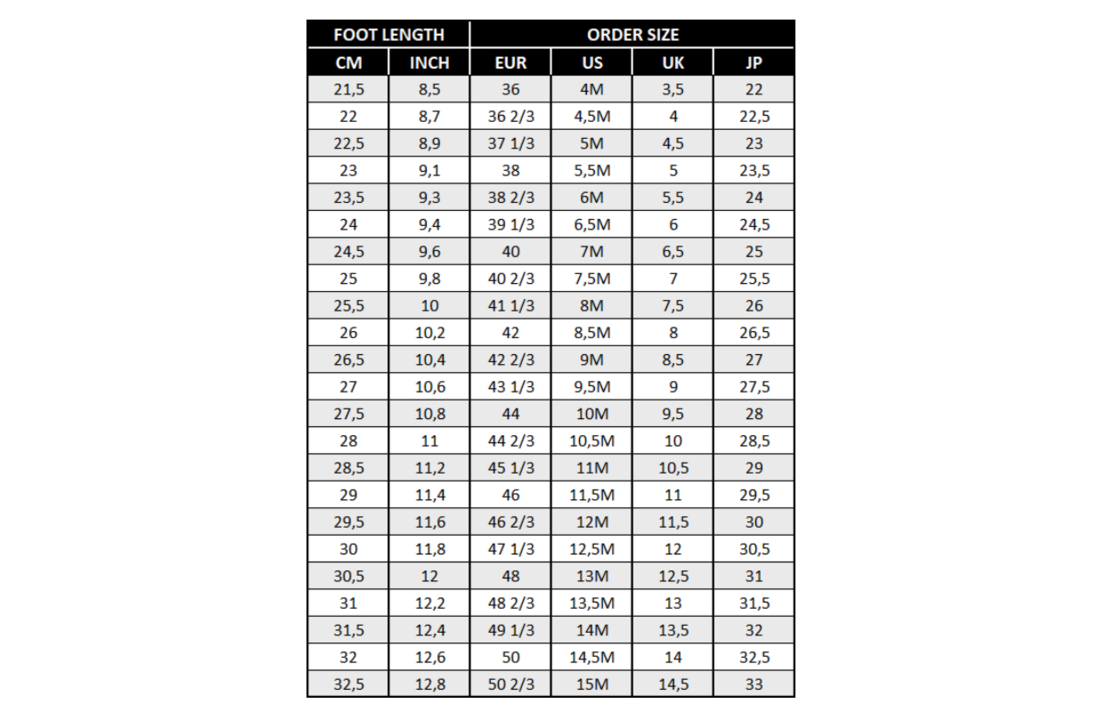 (*Een maattabel is nooit een garantie dat het artikel 100% juist is qua maat. (aangezien postuur, voetvorm, etc veel varianten kennen). Komen passen is de enige manier om 100% zekerheid te hebben m.b.t. de maat en pasvorm)