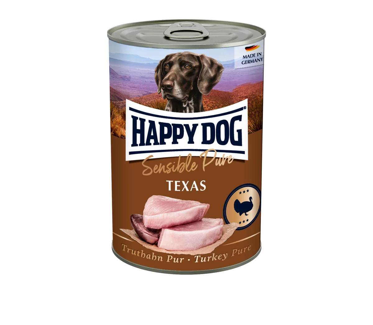 Het natvoer voor honden, Sensible Pure Texas, wordt uitsluitend geproduceerd op basis van vers geslacht kalkoen uit de regio en bevat geen soja, geen plantaardige ingrediënten en geen kleurstoffen en conserveringsmiddelen.