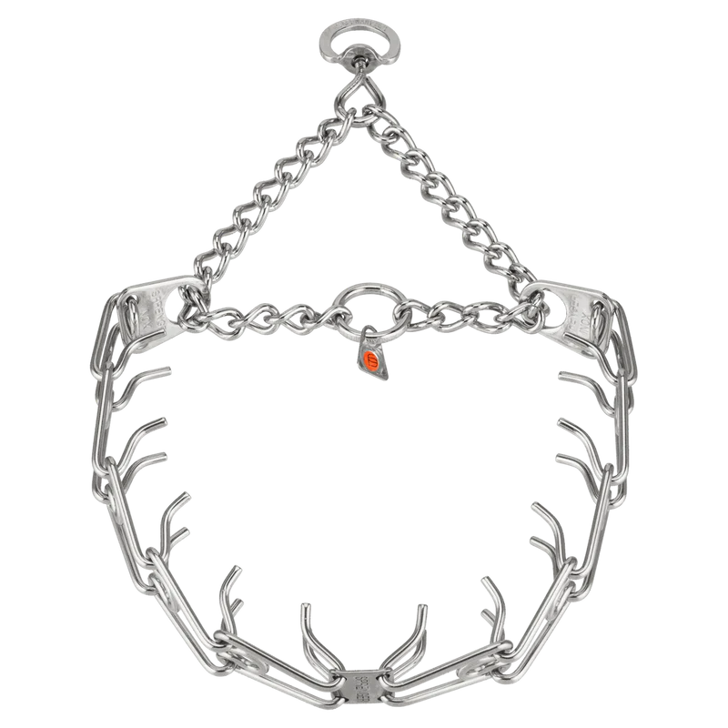 De Ultra Plus-serie van HS Sprenger bevat een karakteristieke middenplaat die de halsband symmetrisch houdt. Deze middenplaat voorkomt dat de schakels draaien of scheef trekken, wat niet alleen de werking verbetert, maar ook het comfort.